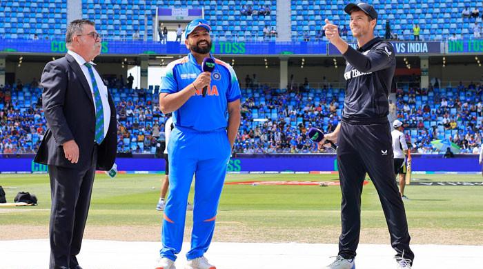 Indian and New Zealand skippers seen during the toss at Dubai International Cricket Stadium on March 2, 2025. — Geo News Live/YouTube